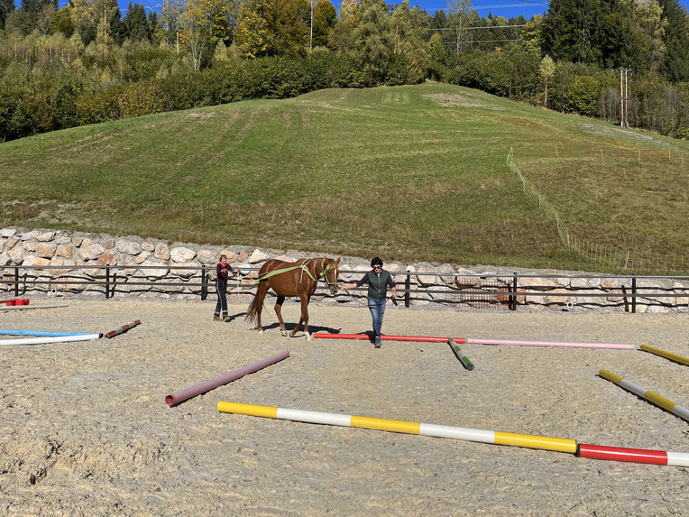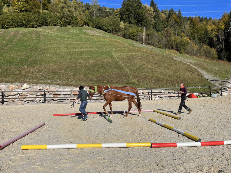 Durch Üben im Lernparcours, viele TTouches® und den Gebrauch von Körperbändern, lernte Maliah sehr gut ihren eigenen Körper kennen und konnte die nötigen Lernschritte sehr schnell meistern. Anbei sieht man sie beim "Fahren vom Boden", das sehr gut für das Gleichgewicht und die Balance des Pferdes ist. Weiters ist es sehr hilfreich für Pferde, die Angst von "hinten" haben.