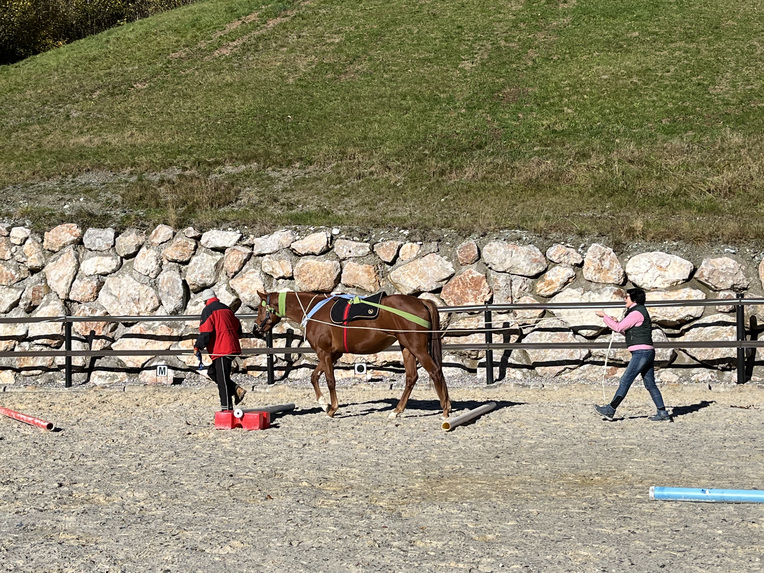Nach einer Phase des Freilaufens, um ihr die Heftigkeit zu nehmen, merkten wir sehr schnell, das sie eine richtig lernbegierige und sehr kluge Stute ist und bald waren die nötigen Umgangsformen erlernt und alle möglichen Vorbereitungsschritte zum Anreiten möglich. Sie liebte die Bewegung beim Longieren, und konnte schon bald Decken und Sattel auf ihrem Körper akzeptieren.
